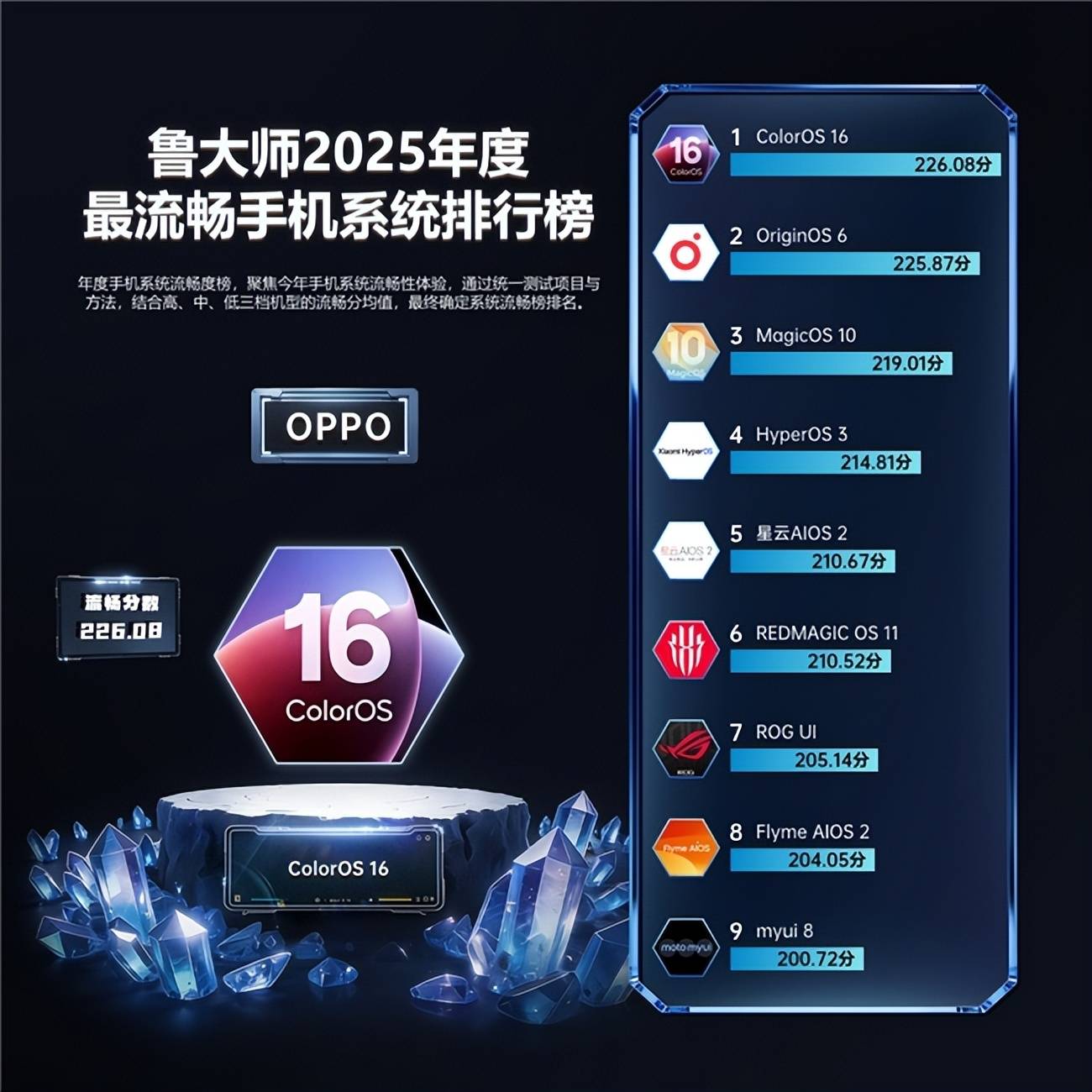 最终,基于鲁大师实验室稳定流畅测试分数和APP端体验分数,ColorOS 16的系统流畅总分为226.08,荣获“鲁大师2025年度最流畅手机系统榜”冠军。这已是ColorOS连续六届夺得该奖项,凸显其技术领先性。